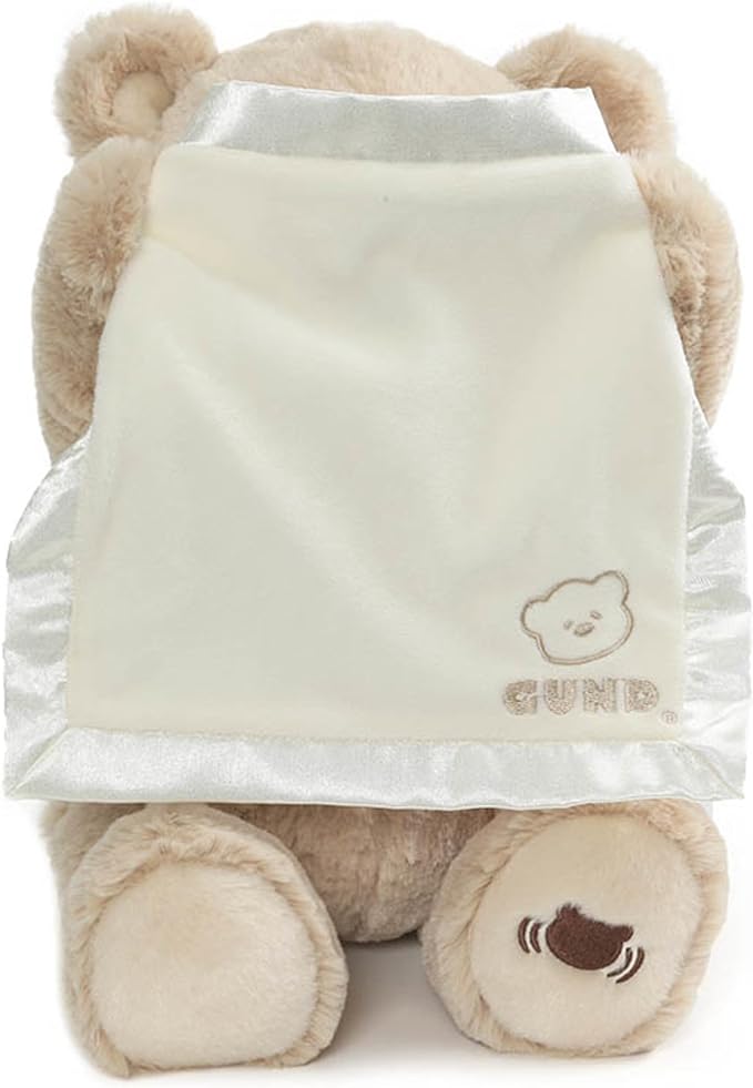 Our animated Peek-A-Boo Bear is a super soft friend ready for a game of peek a boo full of fun and giggles with baby! This 26cm teddy bear with a classic design features a moveable mouth and arms that move up and down during play. At the push of a button, the bear recites one of six different phrases and hides behind the blanket before popping back out to delight baby with an interactive game of peek-a-boo. Peek-A-Boo Bear is surface-washable plush for easy cleaning and appropriate for ages 0+.