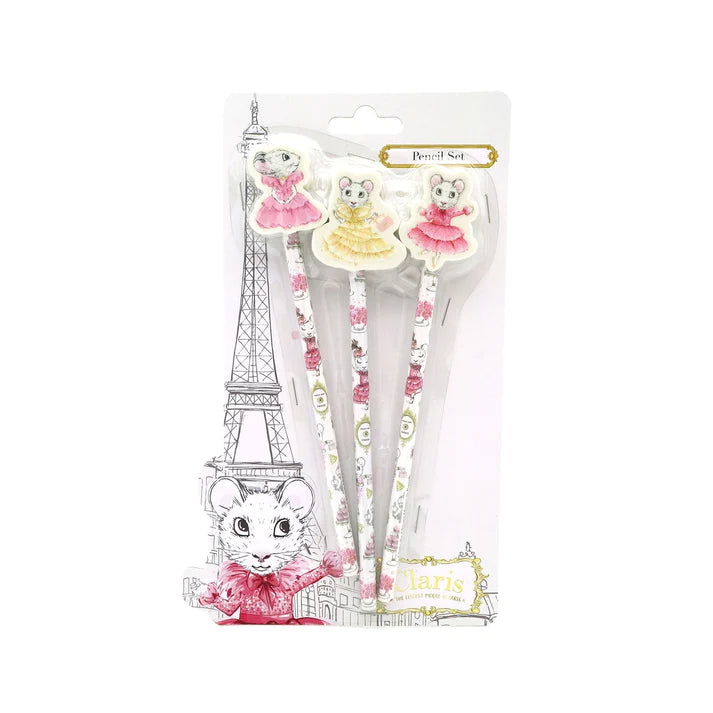 Featuring a beautiful wrap around Claris pattern on the outside of each pencil, the set includes 3 grey-lead pencils, complete with a different Claris shaped eraser topper, each with their own chic look.