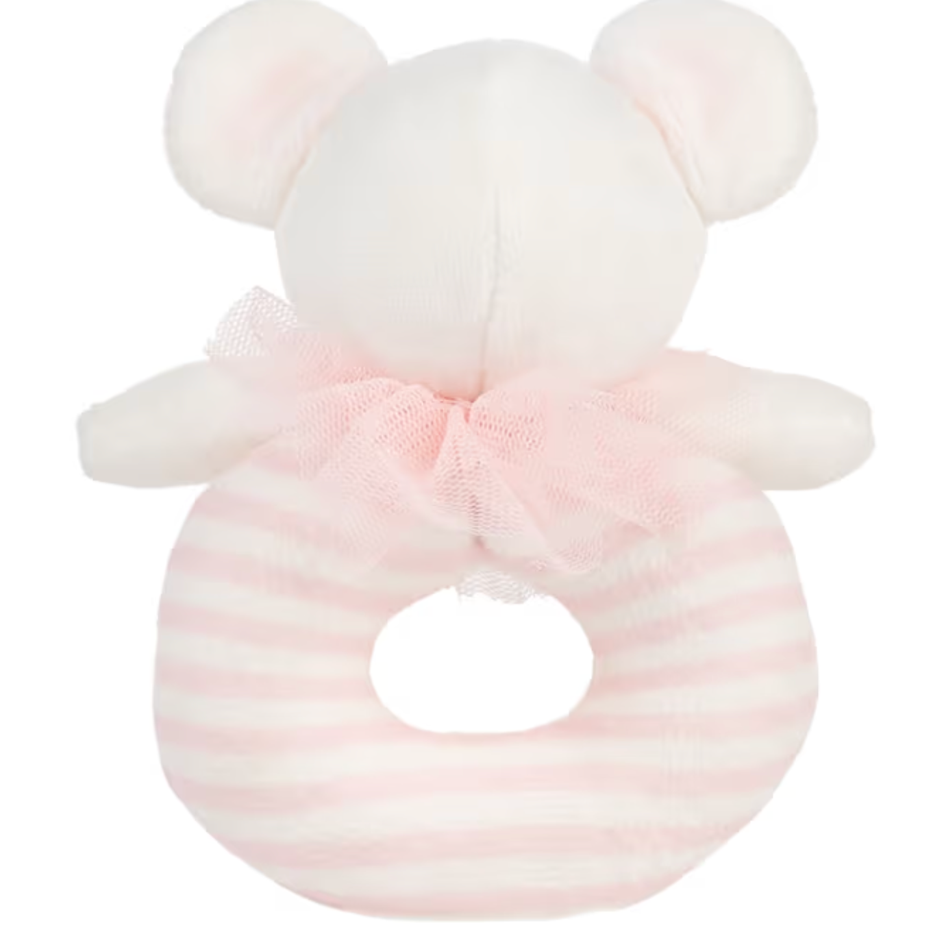 Made from the softest baby-safe plush fabrics with a subtle pale pink and white striped design, it is the perfect size for little hands to grasp and includes a gentle rattling sound to delight and captivate baby.