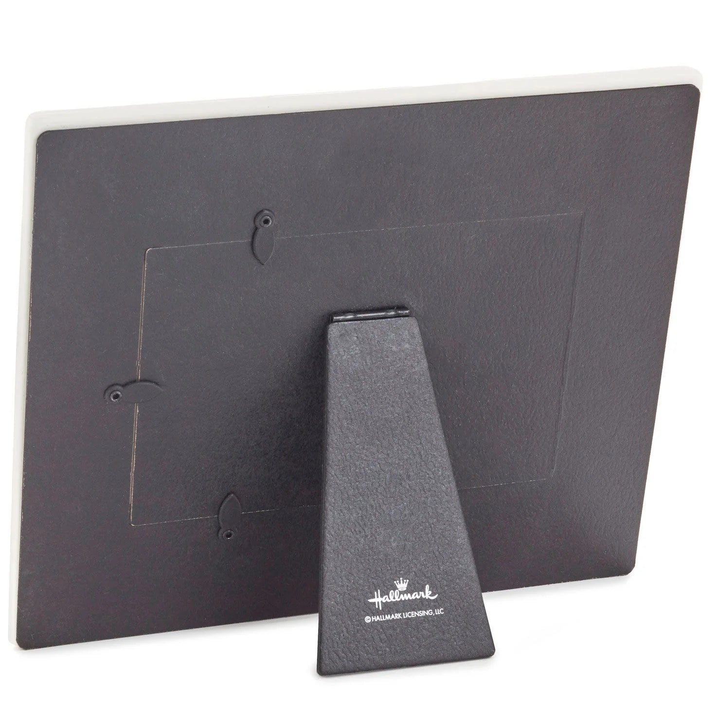 - White and raw ceramic picture frame features debossed, colored lettering.
