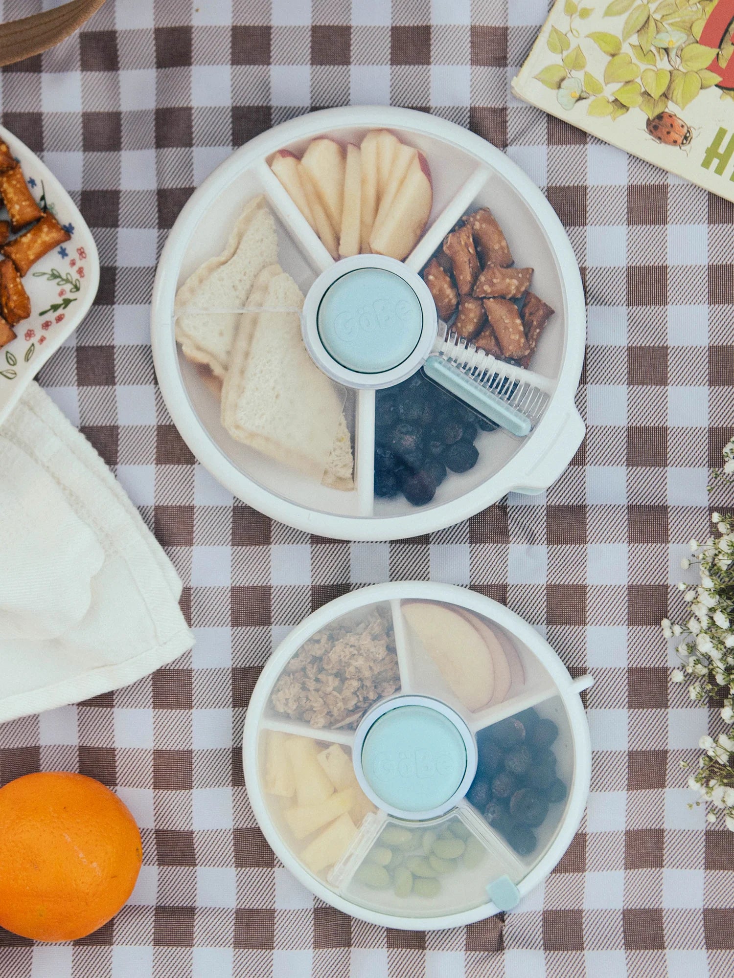 The GoBe Snack Spinner is the only spill resistant snack container that empowers your child to choose between five different snacks in a safe and engaging eating environment. With the simple push of a button, your little one will continue strengthening neural connections by learning how to access each compartment through a flip top mechanism. Moreover, the level of autonomy your child will exercise by actively choosing what to eat will help them develop healthy relationships with food that will continue to grow with them.