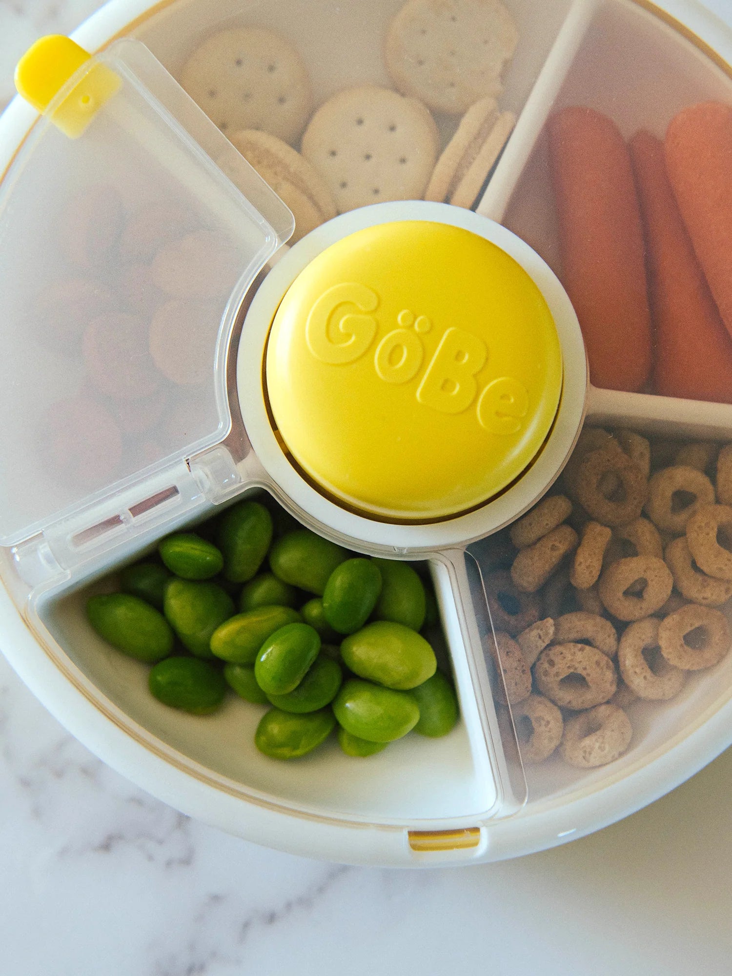The GoBe Snack Spinner is the only spill resistant snack container that empowers your child to choose between five different snacks in a safe and engaging eating environment. With the simple push of a button, your little one will continue strengthening neural connections by learning how to access each compartment through a flip top mechanism. Moreover, the level of autonomy your child will exercise by actively choosing what to eat will help them develop healthy relationships with food that will continue to grow with them.