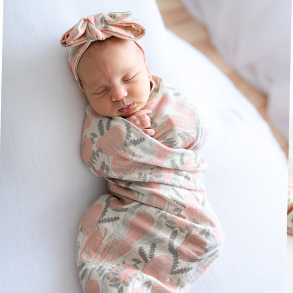 The Boho Baby banksia swaddle wrap, features a custom designed pattern of assorted banksias, designed by a local artist. Made from organic cotton muslin, this wrap is ever so soft and soothing.