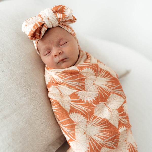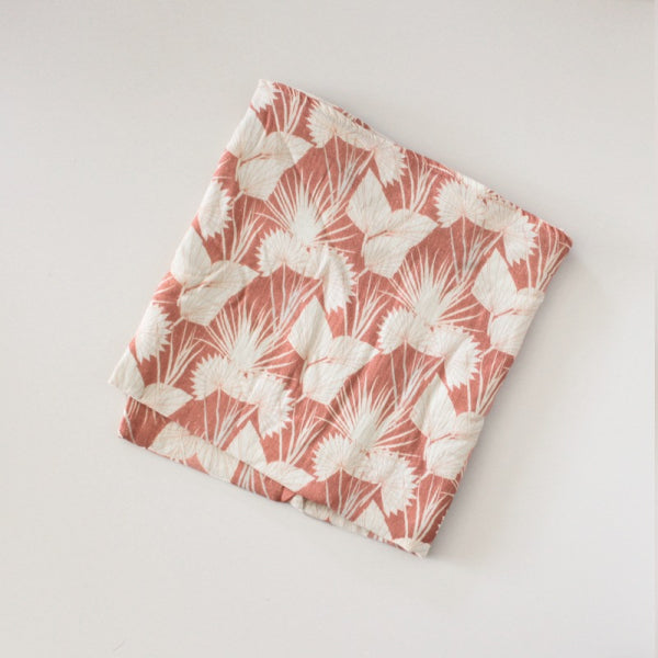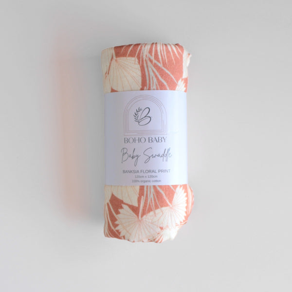 The Boho Baby palms swaddle wrap, features a custom designed pattern of assorted dried palms, designed by a local artist. Made from organic cotton muslin, this wrap is ever so soft and soothing.
