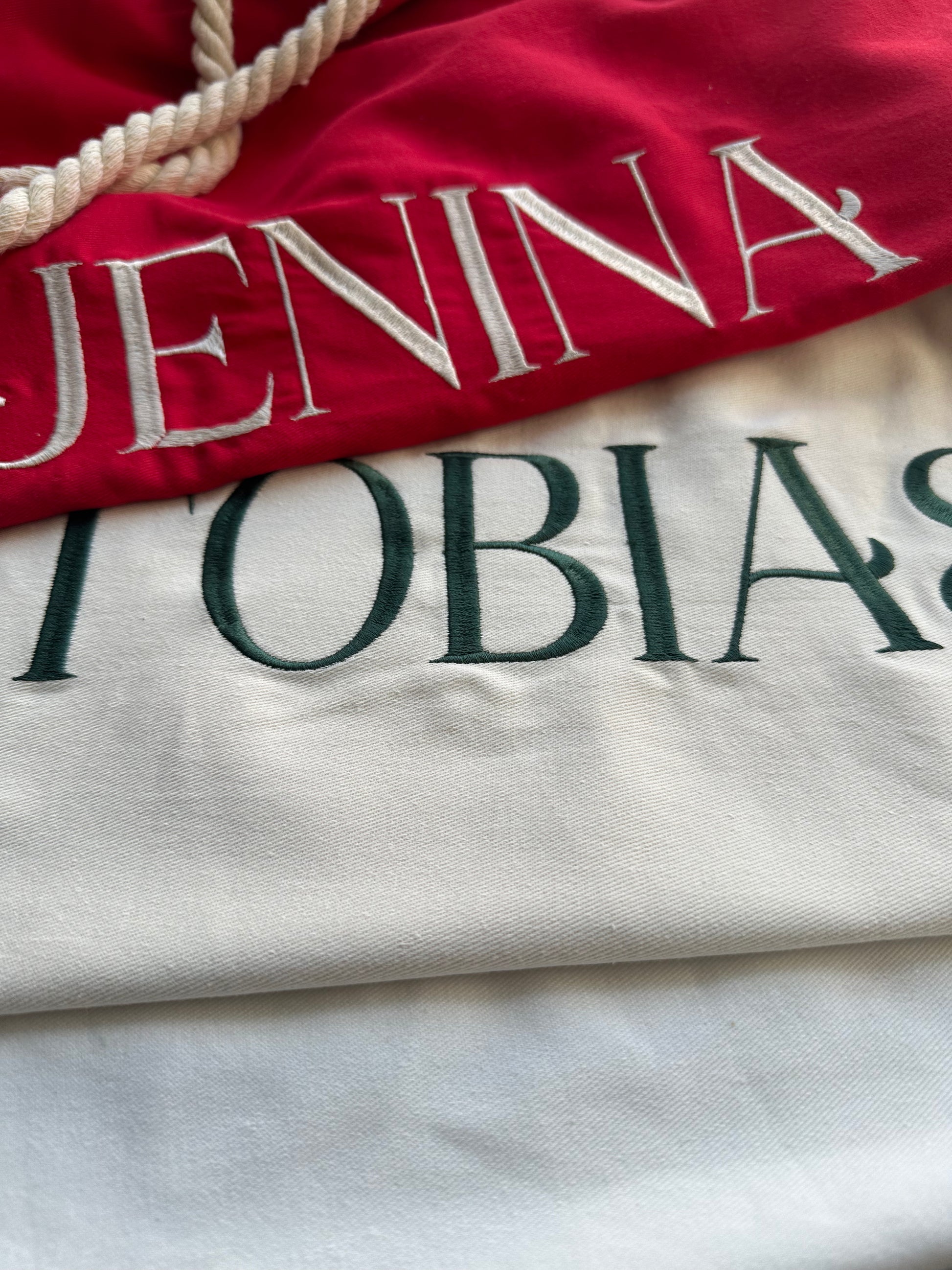 Add a touch of Christmas charm with your child’s name embroidered in festive thread colours chosen to complement each sack: