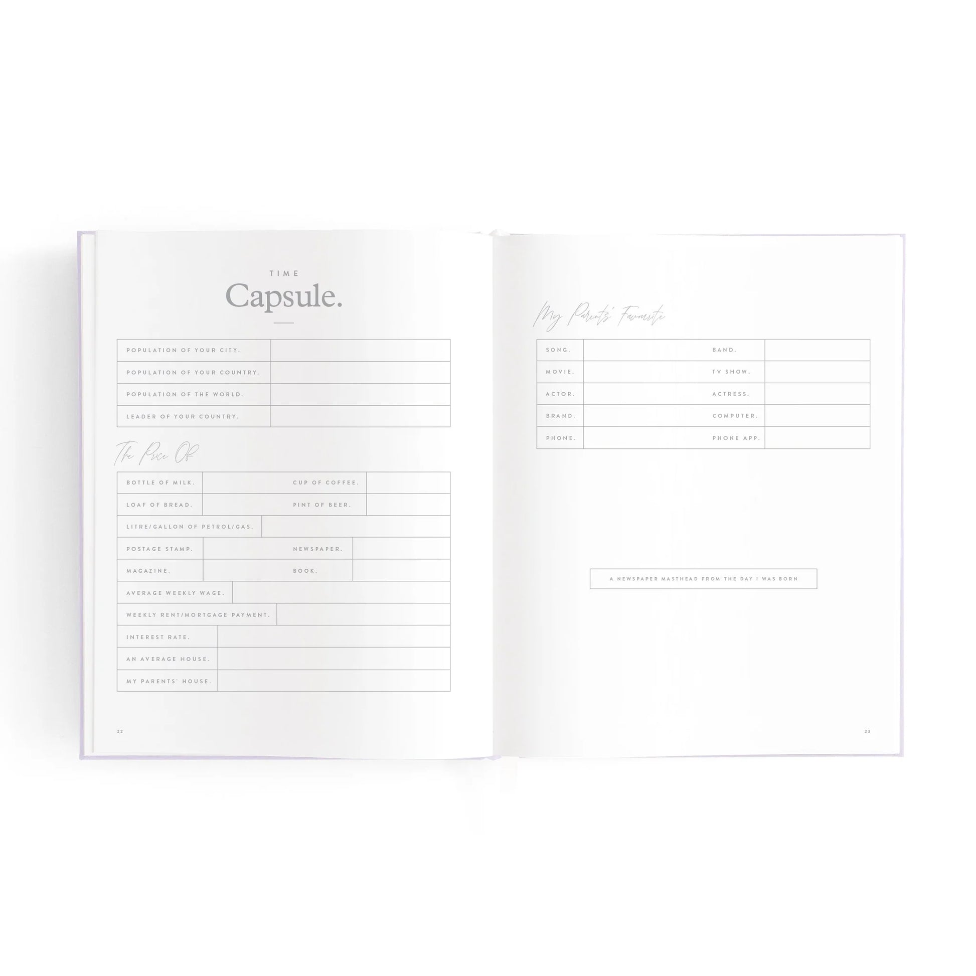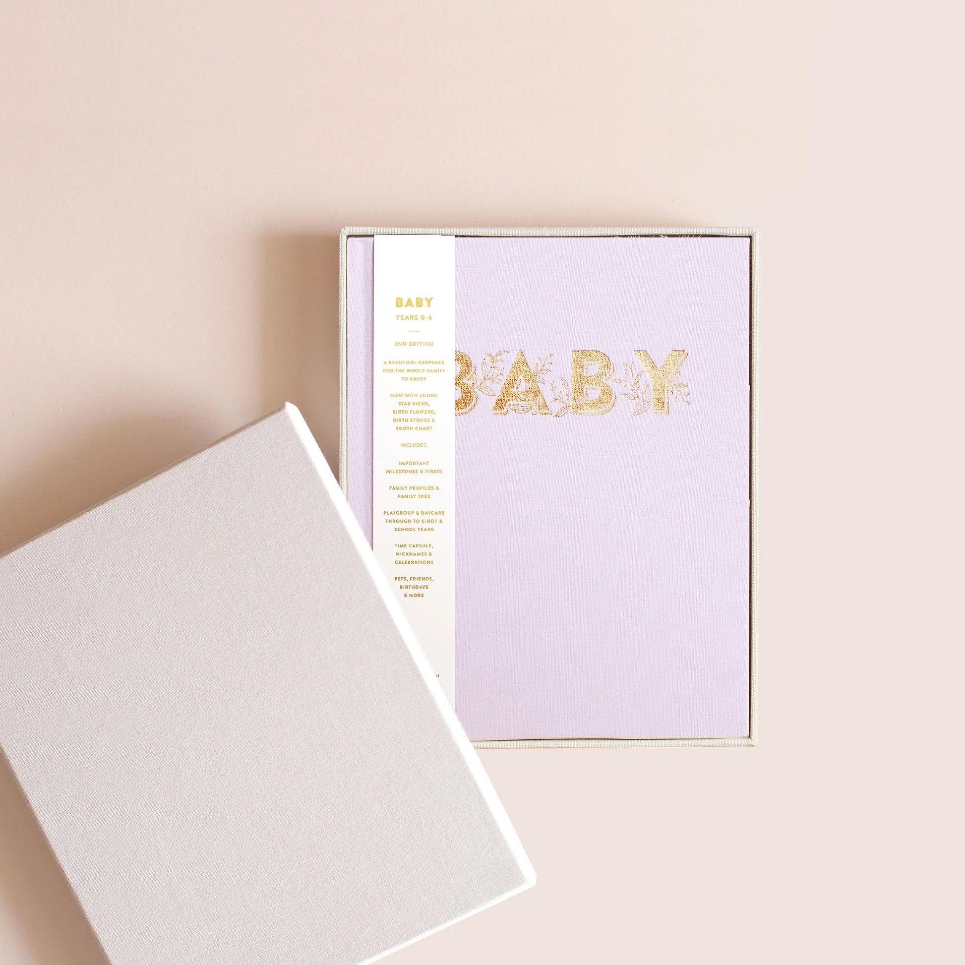 Box: 185 x 228 x 25mm / 7.3 x 9 x 1 inches. Book: 175 x 218mm (15mm spine) / 8.5 x 6.9 inches (0.59 inch spine). 190 pages. Gold foil stamped lilac linen cover. White grosgrain ribbon. 2mm foil stamped hard cover, lay-flat binding. Gold foil end pages and premium 115gsm FCS-certified acid-free paper. Packaged in a cello sleeve with gold foil bellyband. Designed in Australia, printed in China.