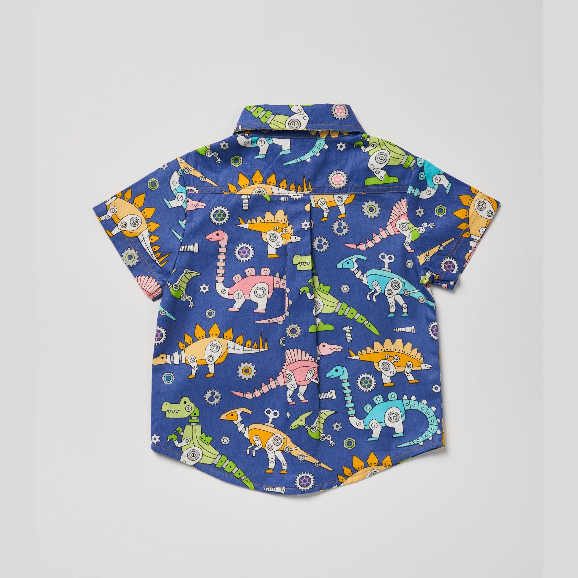 A lively mix of cerulean blue with touches of lime green, mustard, sky blue and flamingo pink, featuring a playful dinosaur print.