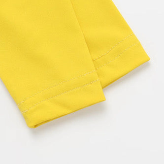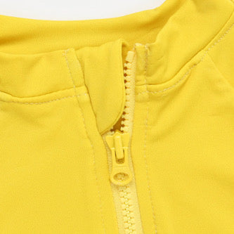 This boys’ set includes a bright yellow long-sleeve rashie paired with tropical print shorts featuring handy pockets — perfect for seashell treasures or beachside snacks.